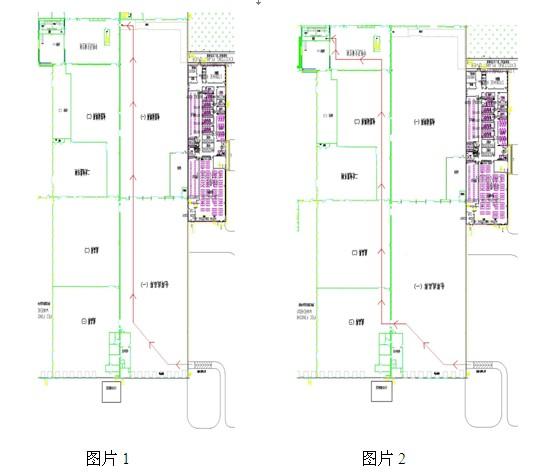 備件倉通往HC包裝包裝通道處先從后勤倉庫卸貨二道門--到倉庫成品庫(一)--到倉庫成品庫(三)--到倉庫成品庫(二)--包裝材料庫(二)--中轉(zhuǎn)及交通空間--到達施工現(xiàn)場存貯維護區(qū)內(nèi)。(見圖片2)