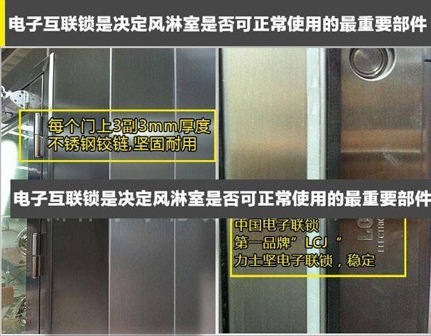 >>風(fēng)淋室雙門:材質(zhì)為全不銹鋼,上部帶3C認(rèn)證鋼化玻璃視窗,下部為不銹鋼平面處理,無凹凸棱角,減少死角;三道3MM厚度不銹鋼鉸鏈,保障門結(jié)實(shí)耐用,門與門框結(jié)合平整、牢固 、美觀,密封性能良好,門開啟靈活。